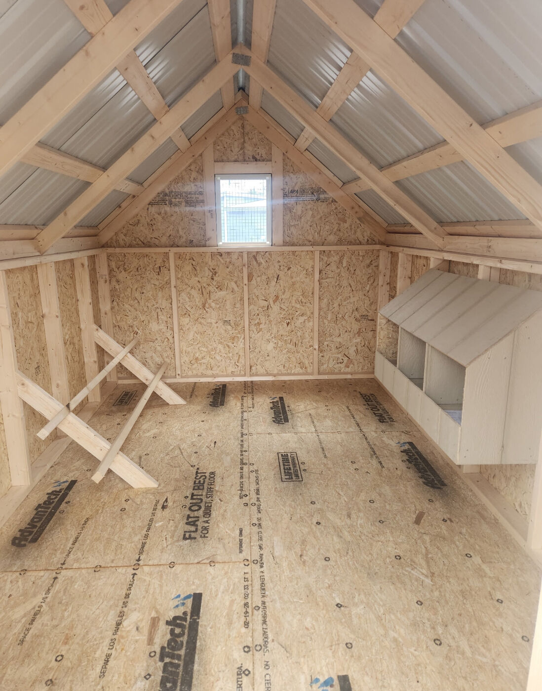 3 Nesting Boxes, Chicken Door, Window, Man Door.